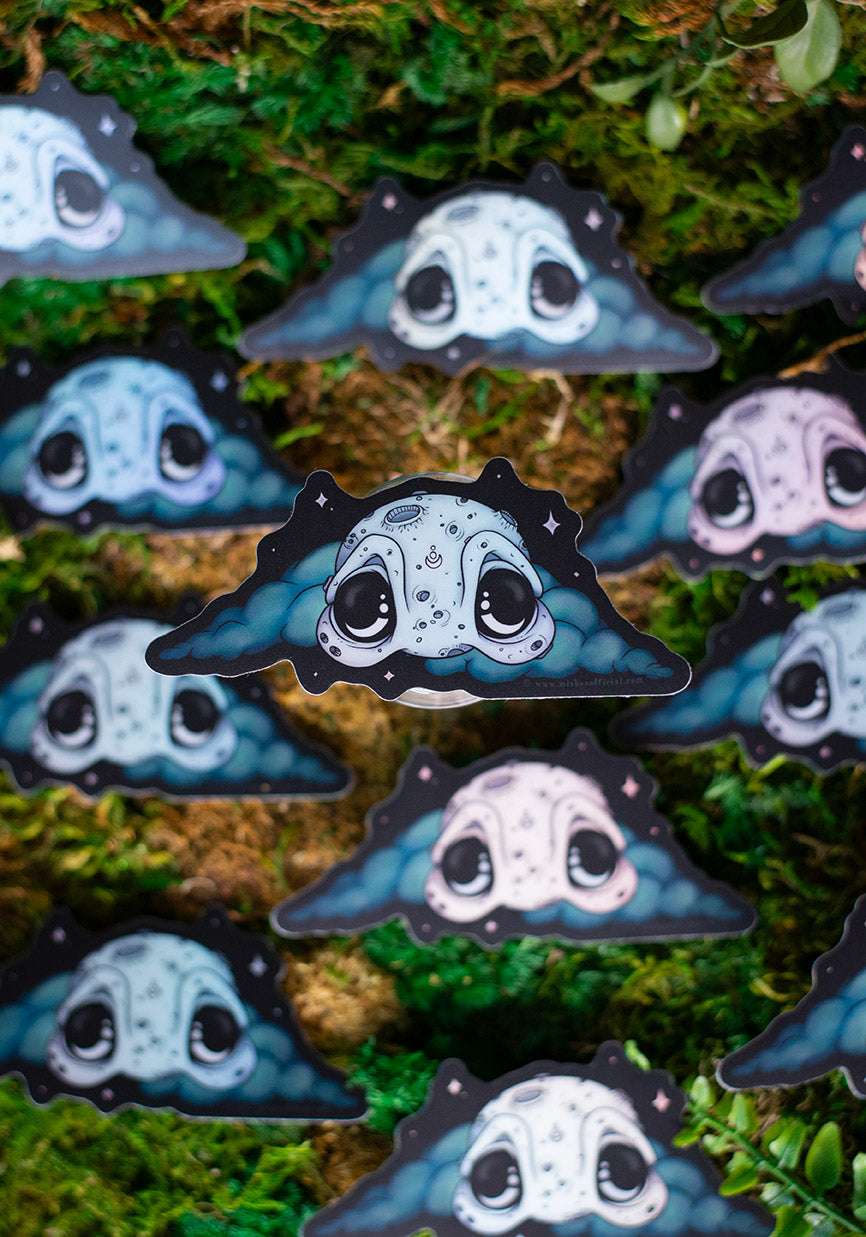 November's sticker is a full moon with clouds and stars, printed on matte holographic paper. Water resistant. Dishwasher safe. Join the Guild as a Friendly Keeper or higher member to get yours!