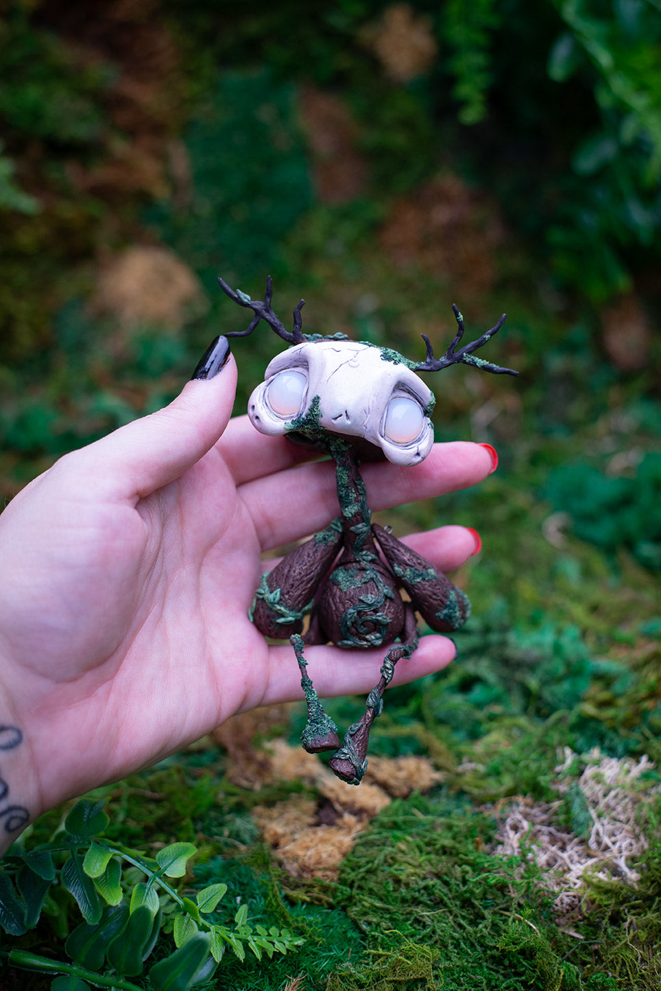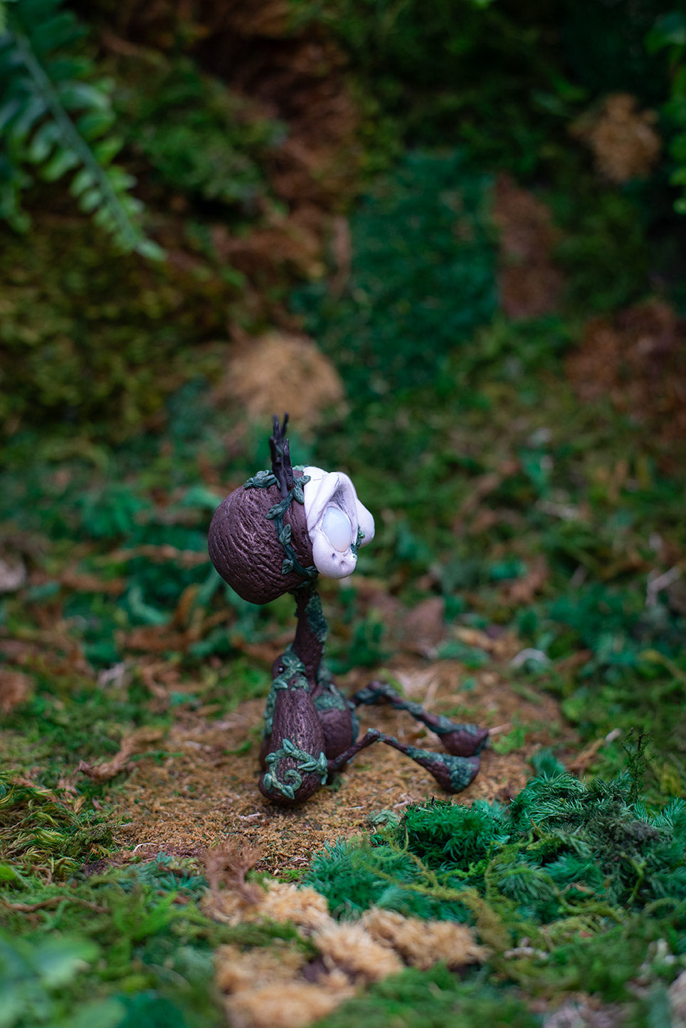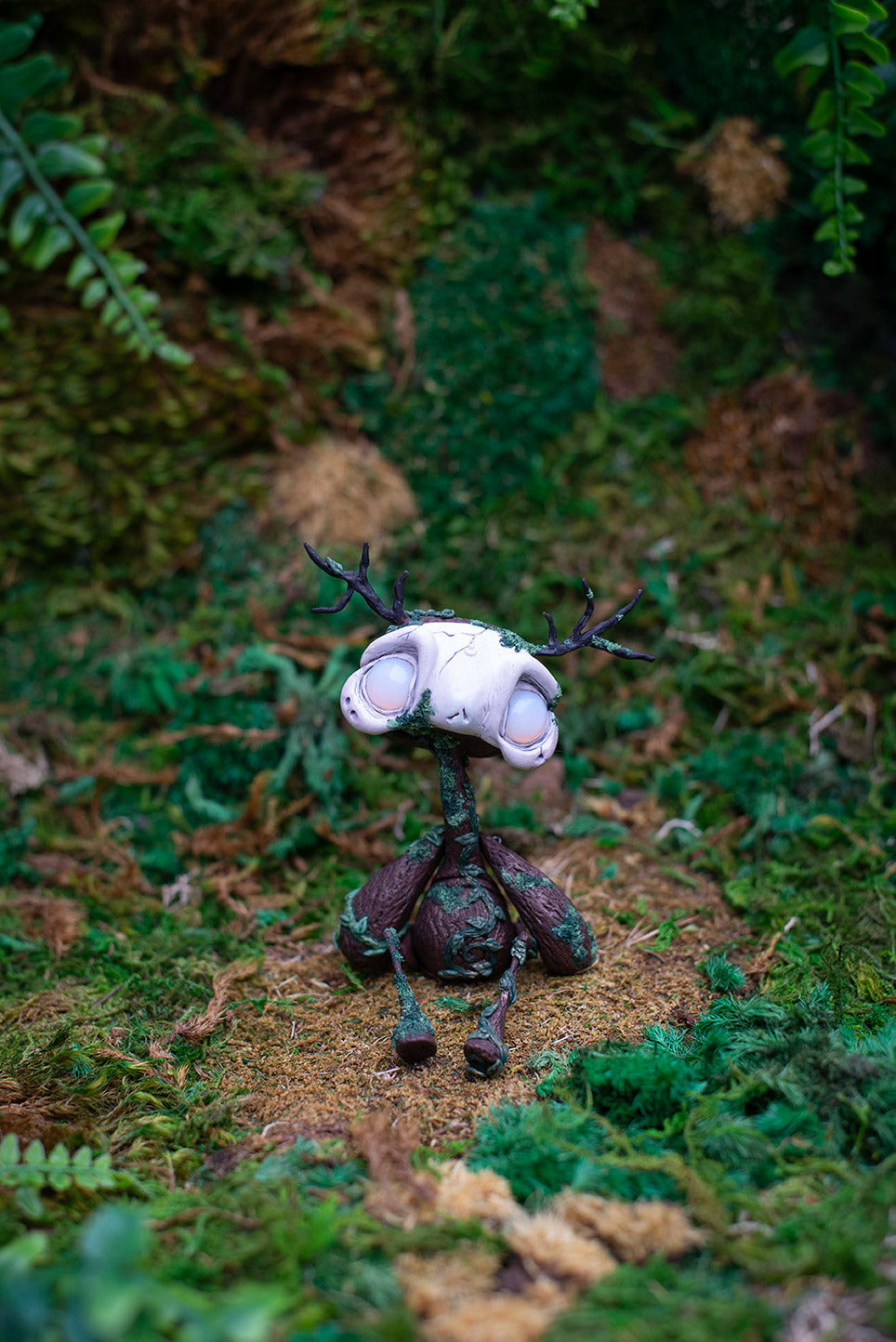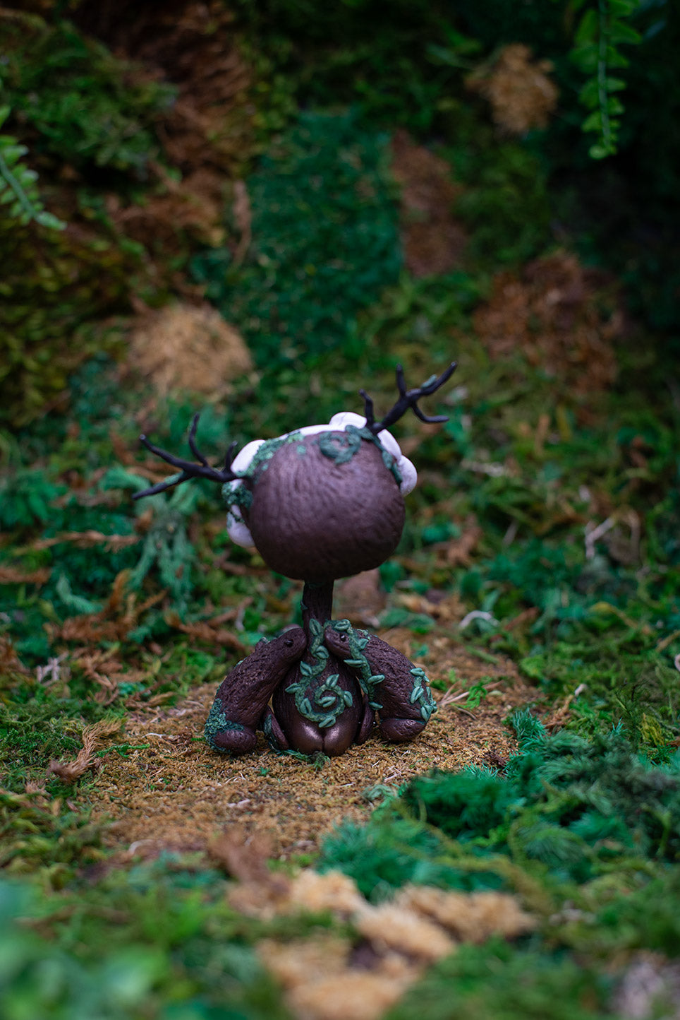 Dark brown forest god adult mish with opalite eyes, antlers, and lots of green moss & vines.