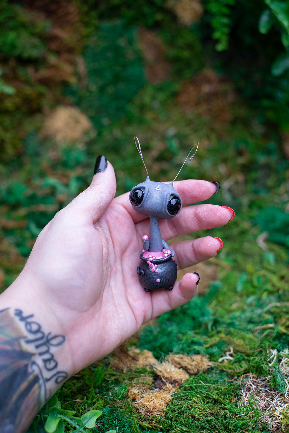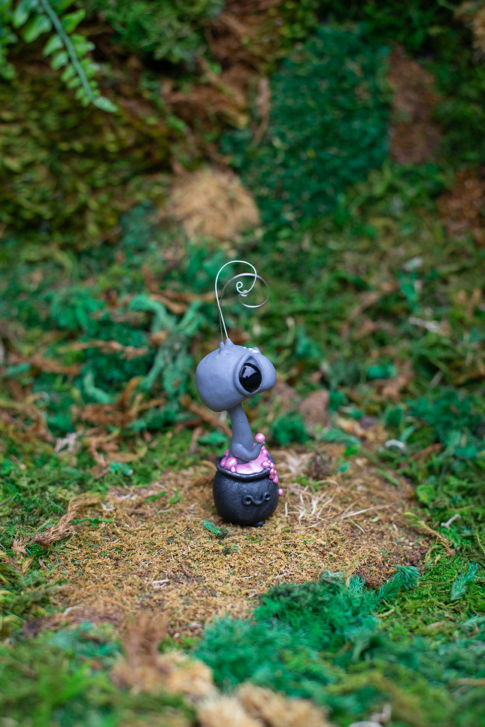 Dusty gray sprocket in a black cauldron with a bubbling pink potion. Sporting classic wire sprocket antenna.