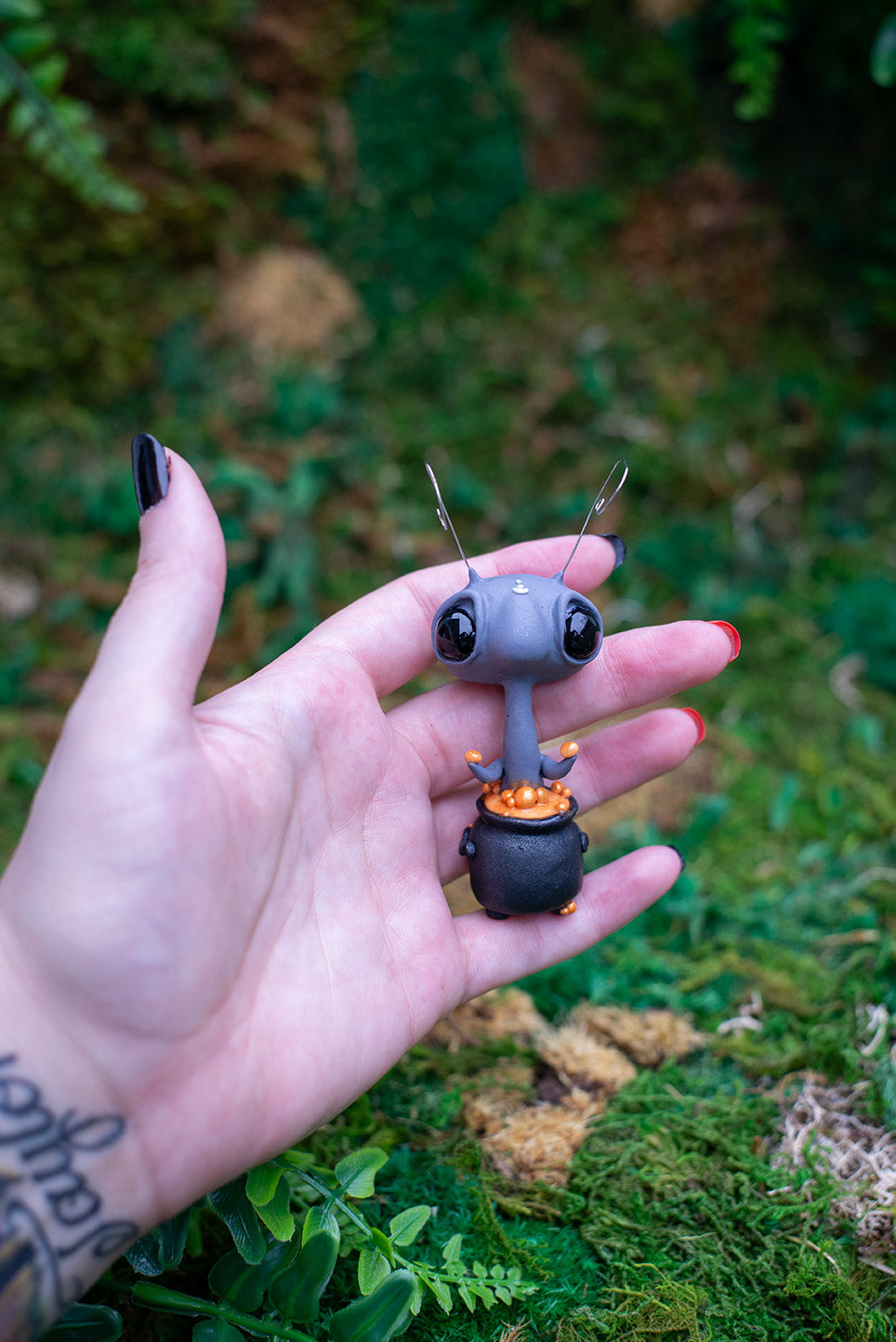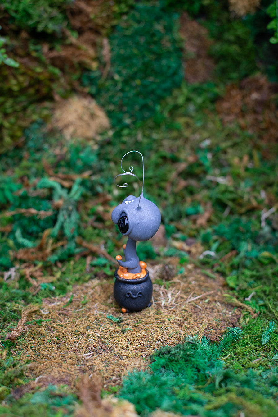 Dusty gray sprocket in a black cauldron with a bubbling orange potion. Sporting classic wire sprocket antenna.
