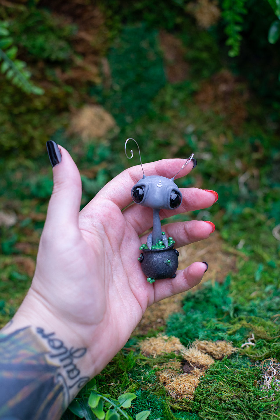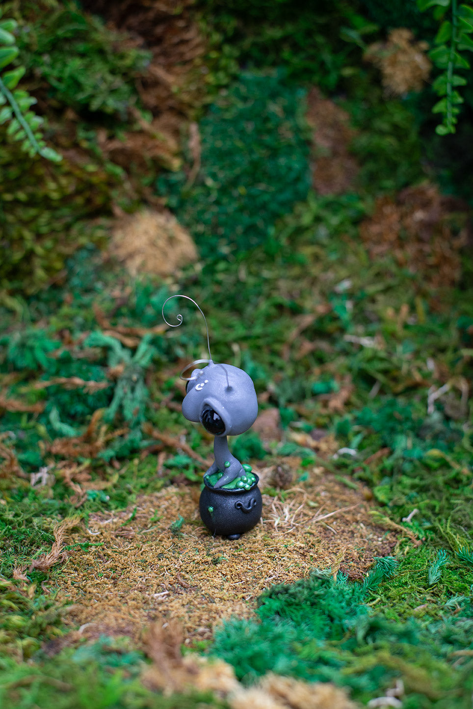 Dusty gray sprocket in a black cauldron with a bubbling green potion. Sporting classic wire sprocket antenna.