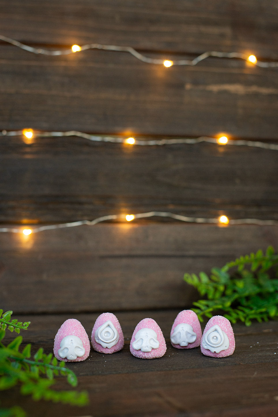 Echoes of Gods show their faces as colorless skulls and cyclops across the surfaces of these pink gumdrops coated in “sugar”.