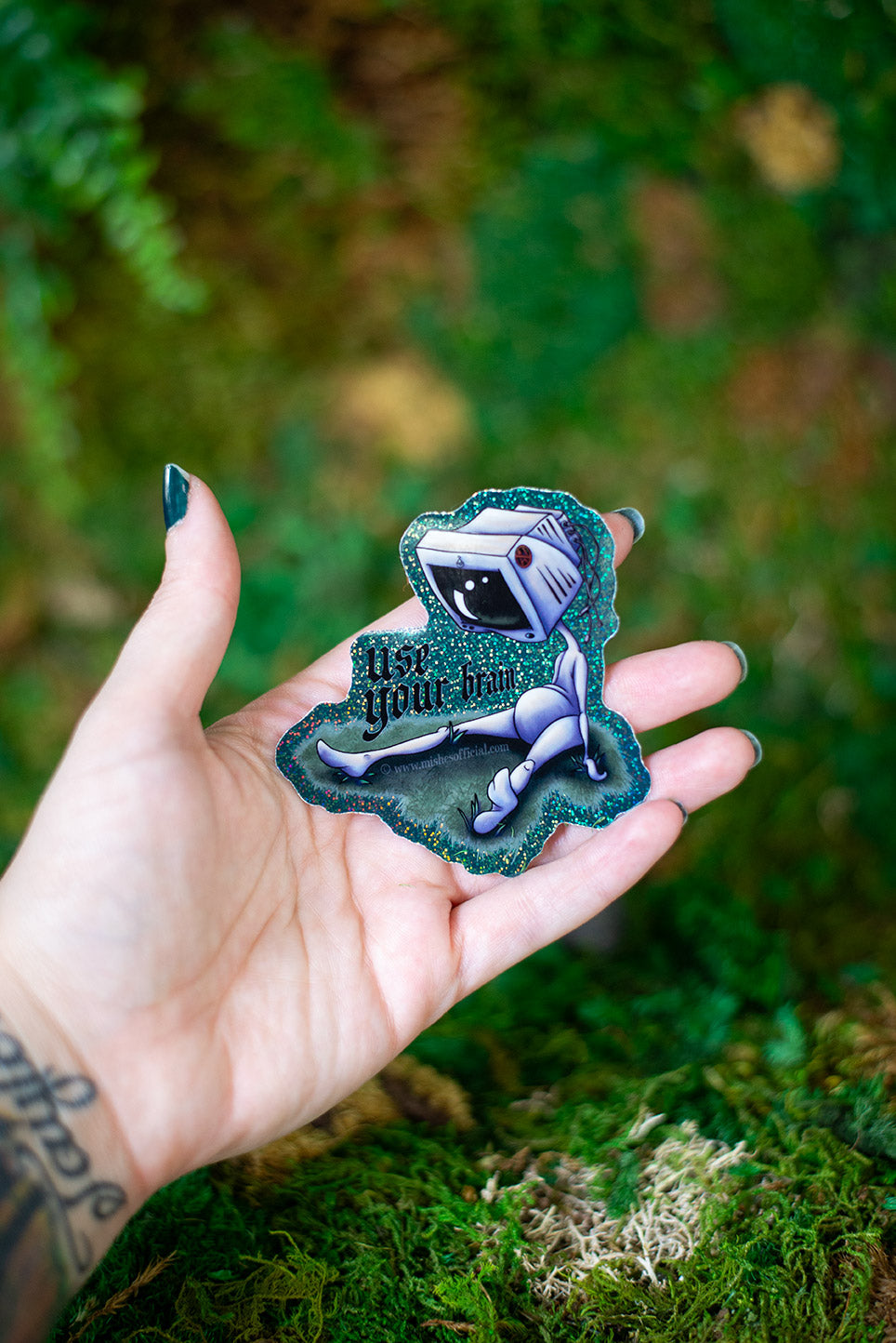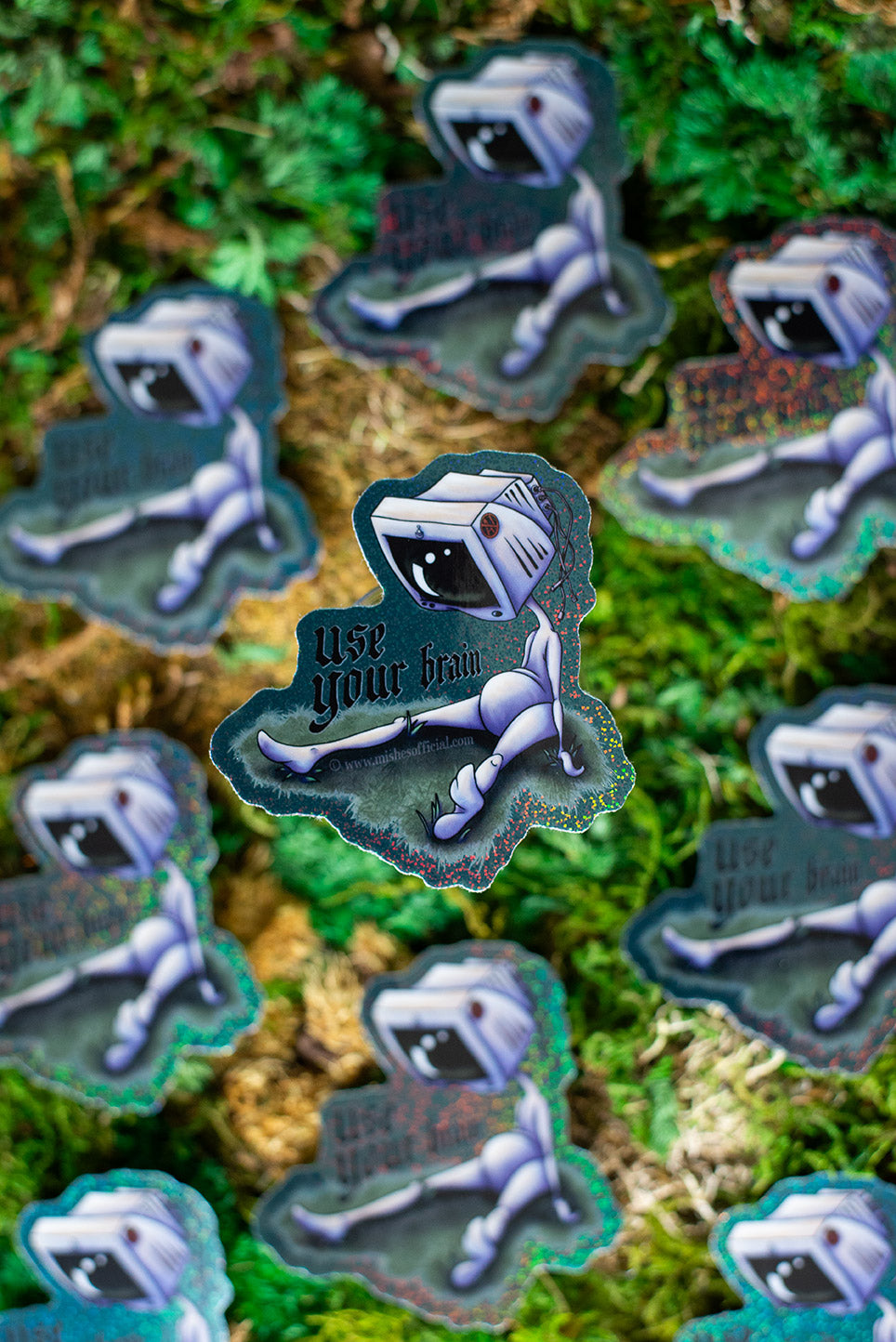 Full color, glitter sticker of hand-drawn & colored computer mish touching grass, with a "NO AI" sticker, and the words "Use your brain"