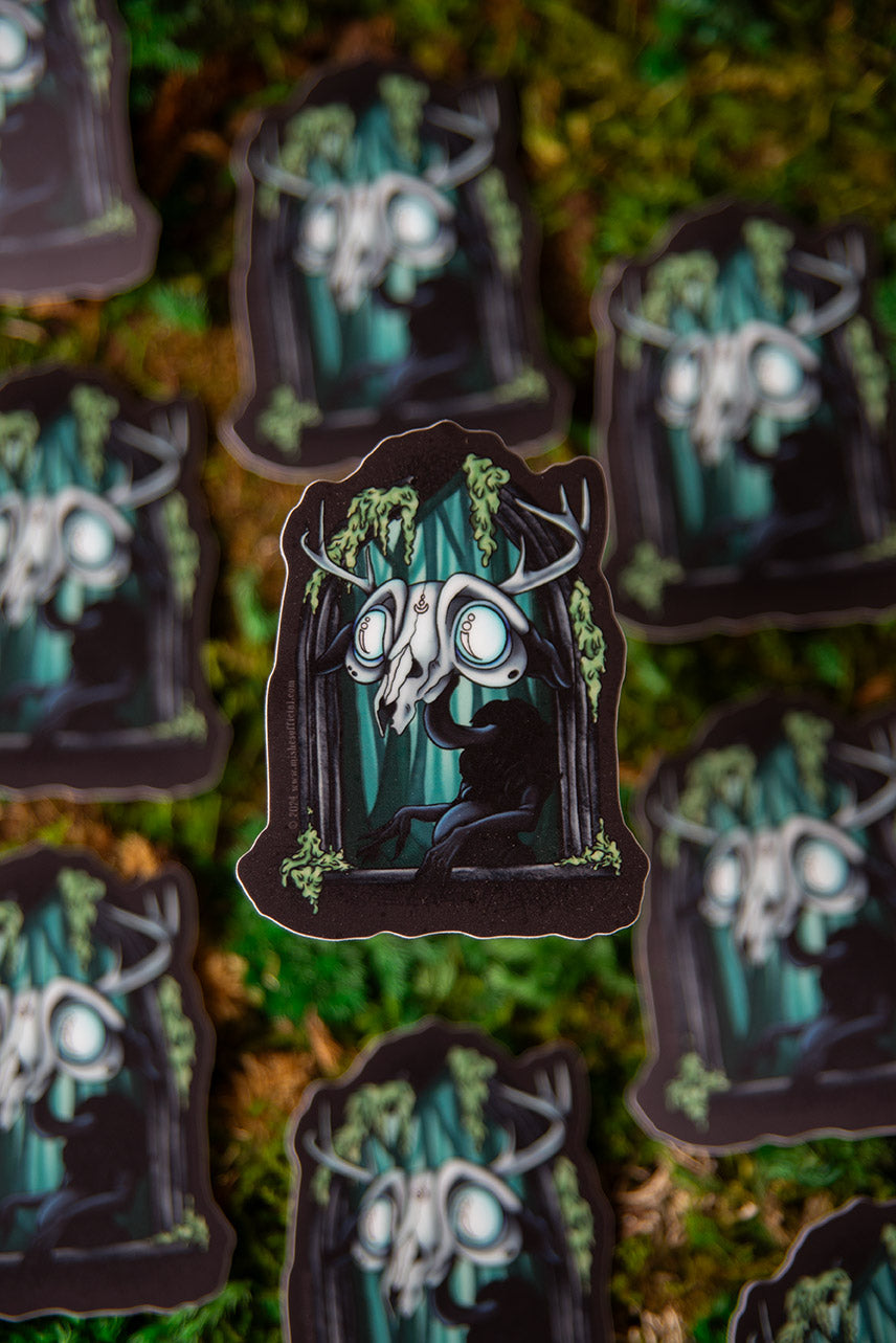 Full color, matte glow in the dark sticker of hand-drawn & colored adult wendigo mish coming through a mossy portal.